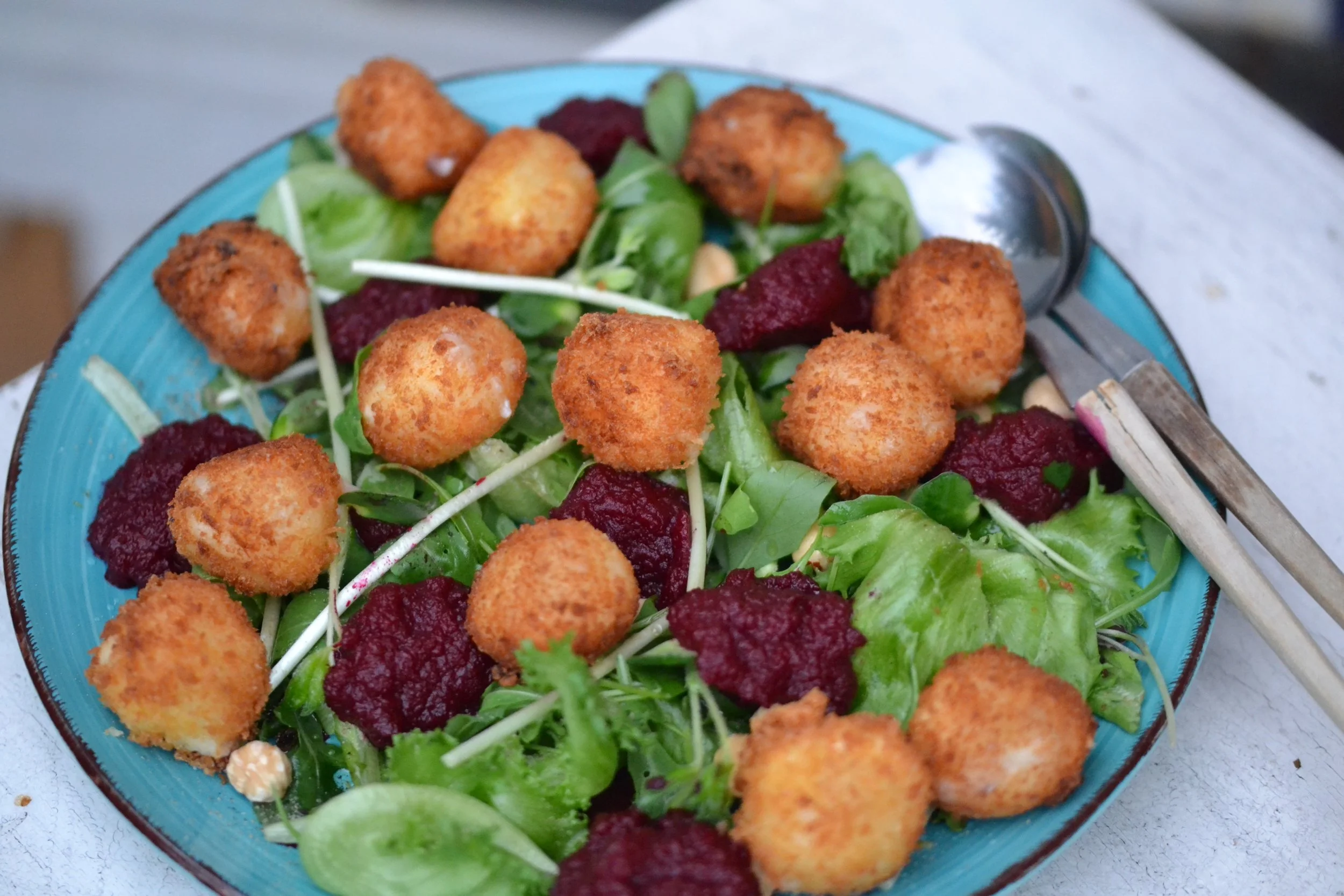 Värm upp oljan och fritera bollarna. Var uppmärksam på att det går mycket snabbt. Låt ostbollarna rinna av på hushållspapper. Lägg upp salladen på ett fat. Lägg upp bollarna på salladen och klicka ut rödbetsröra lite varstans. Toppa med rostade hasselnötter. Servera!